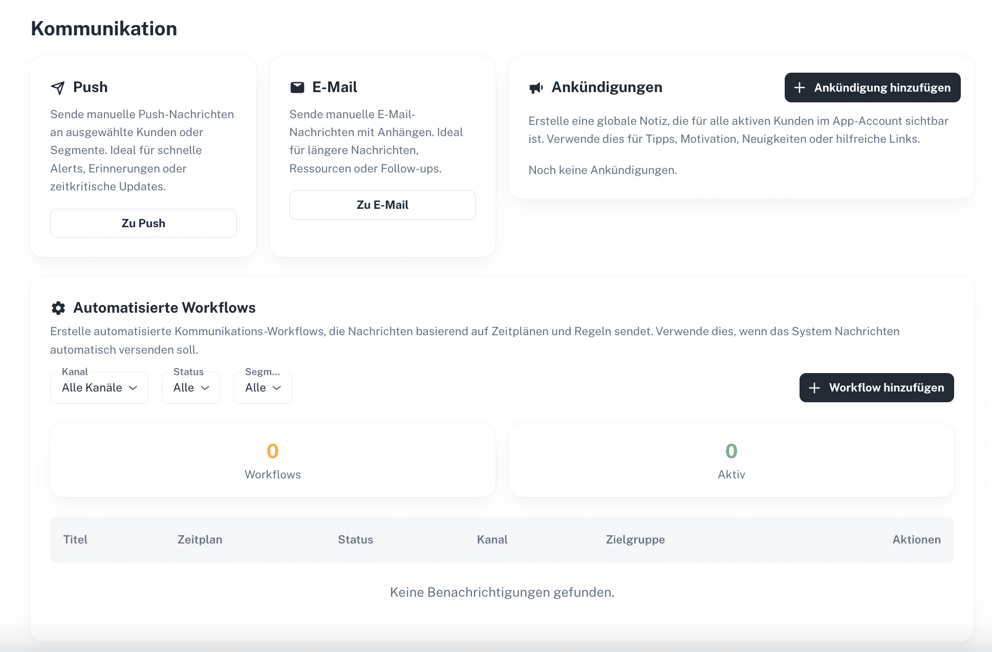Du kannst dann Ankündigungen global für alle Kunden gleichzeitig erstellen – perfekt für allgemeine Mitteilungen, Programmstarts oder saisonale Coaching-Initiativen.